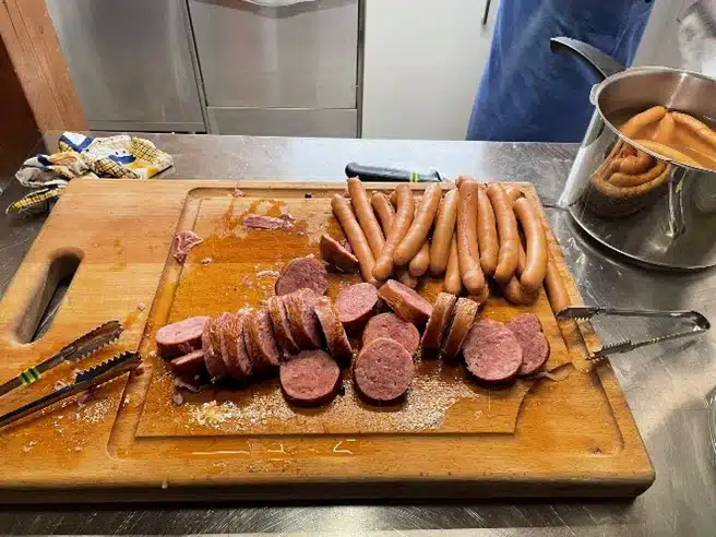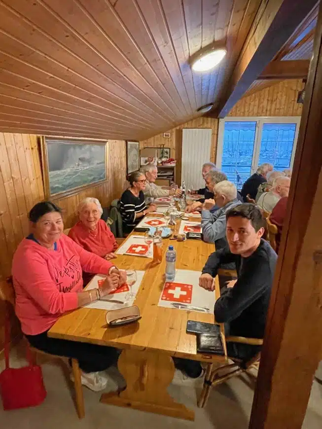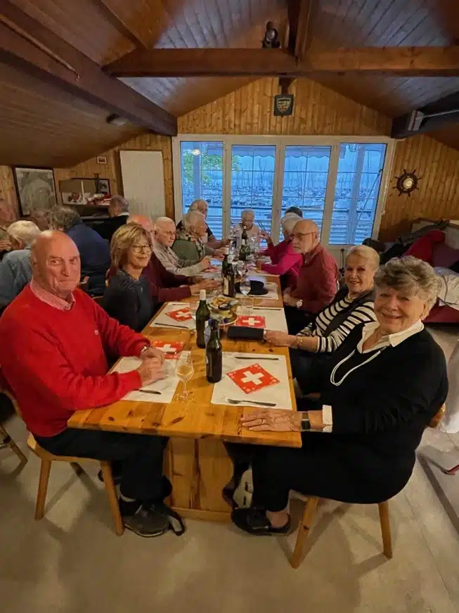 Hier soir vendredi 26 septembre a eu lieu la soirée choucroute. Avec une météo pluvieuse et fraîche à l’extérieur, les quelque 23 convives ont dégusté dans une ambiance chaleureuse l’excellente choucroute copieusement garnie préparée par Michel Schaub. Le repas s’est achevé avec un dessert glacé et meringué aux parfums de vanille et de pêche de vigne.